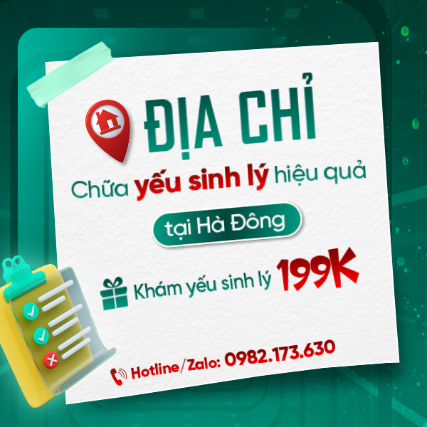 Bài viết đã giải đáp thông tin yếu sinh lý có chữa được không và gợi ý địa chỉ khám chữa yếu sinh lý hiệu quả ở Hà Đông. Nếu còn bất cứ thắc mắc nào khác, các bạn vui lòng liên hệ Hotline/Zalo: 0982.173.630 hoặc ĐẶT LỊCH KHÁM để được hỗ trợ tốt nhất.